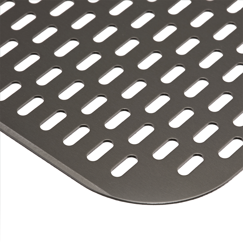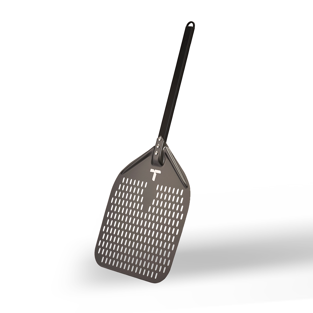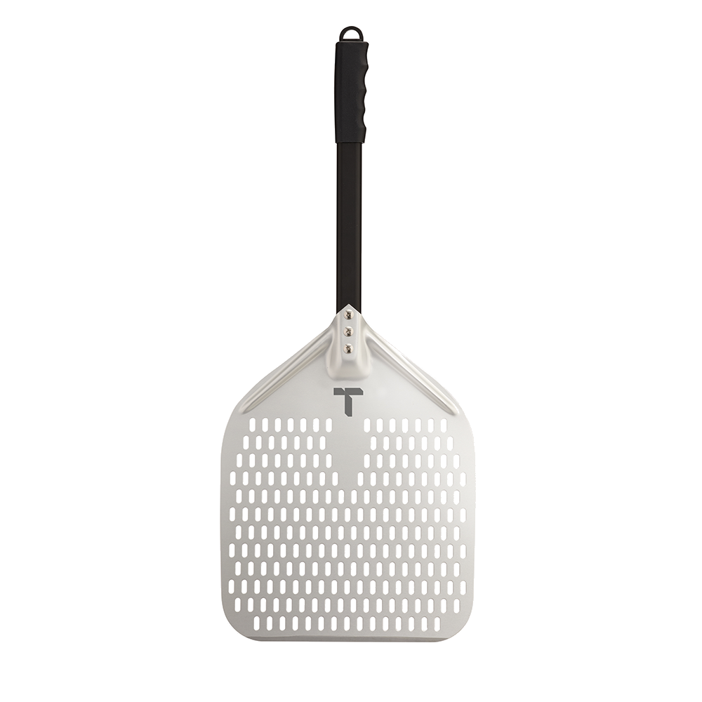 The Turpone Pizza Peel is a professional-grade, perforated peel designed for the easy placement of the pizza dough into your Turpone Pizza Oven. This aluminum pizza peel has an anodized finish. Its tapered front edge is designed to allow the peel to slip effortlessly under the dough while the perforations avoid excess flour to slide onto the stone. The Turpone Pizza Peel has an integrated loop for easy hanging when not in use.